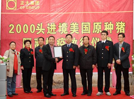 放行儀式上,陜西出入境檢驗(yàn)檢疫局代表做了檢疫放行報(bào)告:“經(jīng)過(guò)3個(gè)多月的隔離檢驗(yàn),正大集團(tuán)農(nóng)牧食品企業(yè)(中國(guó)區(qū))引進(jìn)的2000頭原種豬完全符合安全檢疫標(biāo)準(zhǔn),準(zhǔn)予放行。”陜西出入境檢驗(yàn)檢疫局代表為正大集團(tuán)陜西區(qū)陳強(qiáng)總裁頒發(fā)了《種豬檢疫合格證書》。