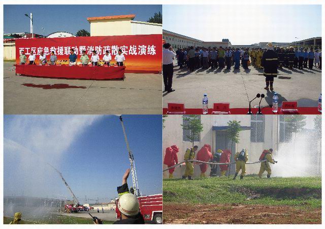 洛陽市安監(jiān)局領(lǐng)導(dǎo)、洛陽市消防支隊領(lǐng)導(dǎo)、區(qū)領(lǐng)導(dǎo)迅速趕赴現(xiàn)場指揮救援,8臺消防車、2臺救護(hù)車在公安交警車開道下呼嘯而至,120名消氣防戰(zhàn)斗員訓(xùn)練有素展開救援,生產(chǎn)調(diào)整組、安全環(huán)保組、警戒保衛(wèi)組、設(shè)備搶修組、信息管理組共50人分別按預(yù)案井然有序開展現(xiàn)場工作。由于反應(yīng)迅速,處置得當(dāng),沒有造成周圍水體、空氣環(huán)境污染,沒有發(fā)生其他次生事故,1名中毒的現(xiàn)場操作人員得到及時救治。本次演練為力求貼近實戰(zhàn),對突發(fā)事故應(yīng)急處理真正起到指導(dǎo)和演練作用,改變以往演練模式,應(yīng)急指揮部演練中還臨時增設(shè)了演練科目。