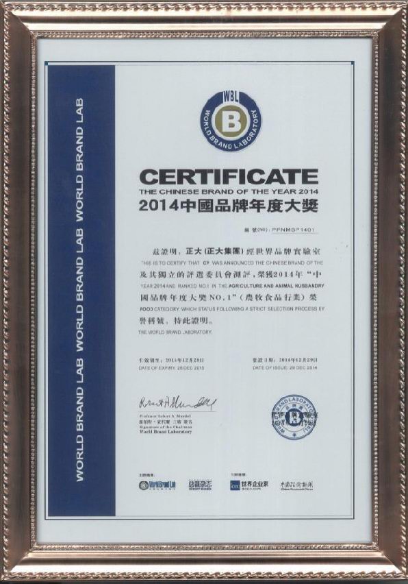 2014年12月29日,“總裁世界年會”在北京東方君悅大酒店舉行。本次大會揭曉了享有“中國品牌奧斯卡”之稱的 “世界品牌實驗室2014年中國品牌年度大獎”評選結果,正大集團、中國國航、國家電網(wǎng)、騰訊控股、中國人壽、中國國旅、北汽集團、華為技術、長虹電器等30個活躍在中國經(jīng)濟舞臺的領軍品牌榮獲 “中國品牌年度大獎”,正大集團以在農(nóng)牧食品業(yè)多年的探索實踐和管理經(jīng)驗,以及良好的產(chǎn)品品質(zhì)和品牌知名度,榮獲農(nóng)牧食品行業(yè)“中國品牌年度大獎***”榮譽稱號。哈佛商學院教授約翰?戴騰博士(John Deighton)、耶魯大學管理學院教授萊維·多爾博士(Ravi Dhar)分別進行頒獎及致詞。